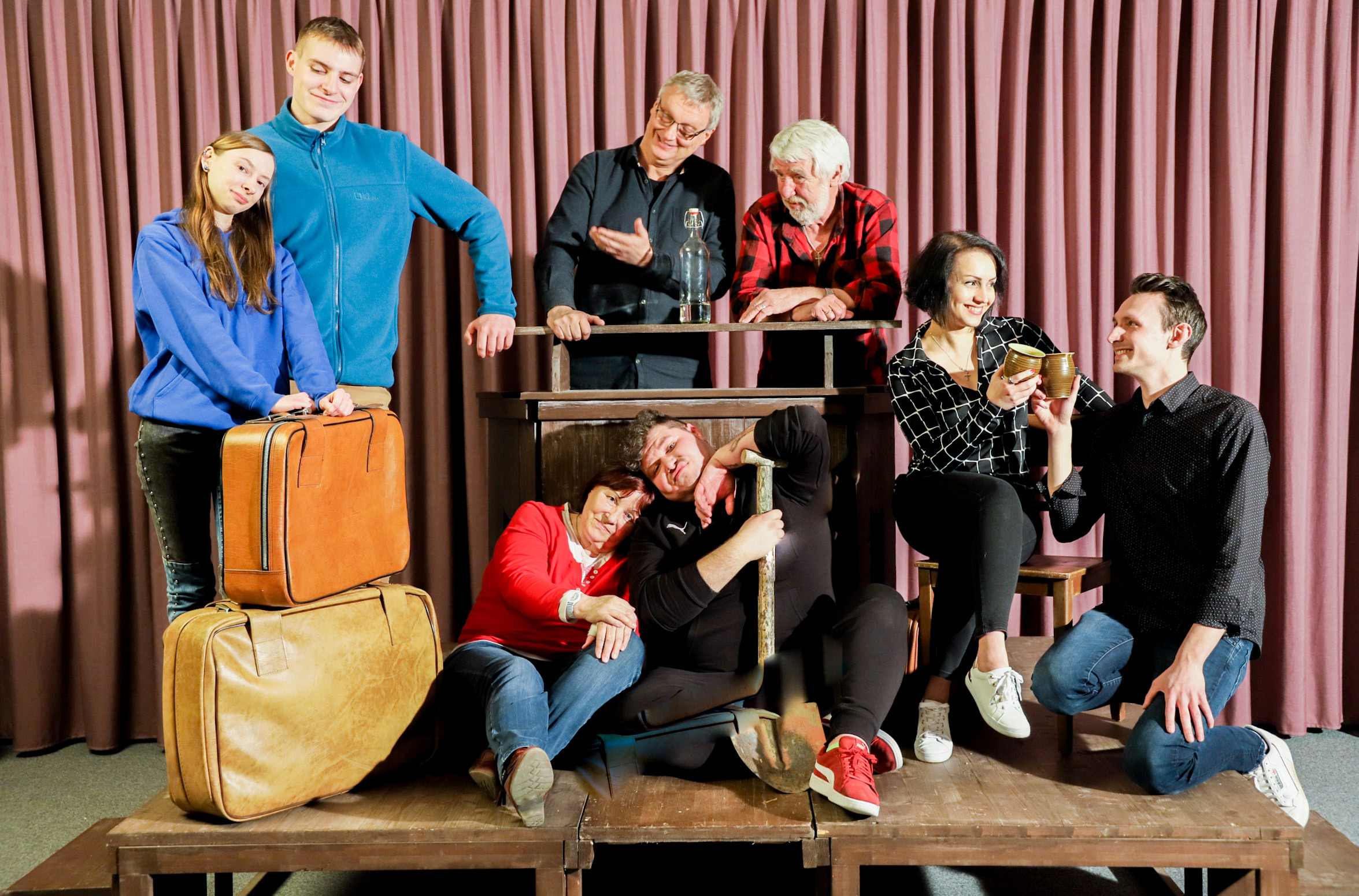 Das Stück „Das Wirtshaus im Spessart“: Comtesse Liesel von Sandau (ich) und ihre Zofe Jette von Bülow (Kassandra von den Steinen) landen zusammen mit dem Handwerksburschen Felix (Conrad Voigt) im Wirtshaus im Spessart, in dem der Räuberhauptmann Rinaldo (Lukas Hercher) mit den Räubern Wilhelm (Chris Henkel) und Paula (Ursula Jahn) haust. Liesel wird als Geisel genommen, aber ihr geiziger Onkel Balduin (Frank Grünert) rückt kein Geld heraus. In diesem doppelbödigen witzig-verwegenen Spiel wird getrickst, werden unentwegt Kleider und Rollen getauscht und mit frechen und fröhlichen Frivolitäten gemischt – und all das hebt der TSL darüber hinaus in die 1920er Jahre. Das Stück ist für eine solch kleine Besetzung wie unsere ausgelegt, es wird nicht genauso sein wie im Film, aber natürlich gibt es den Ohrwurm „Ach, das könnte schön sein“.